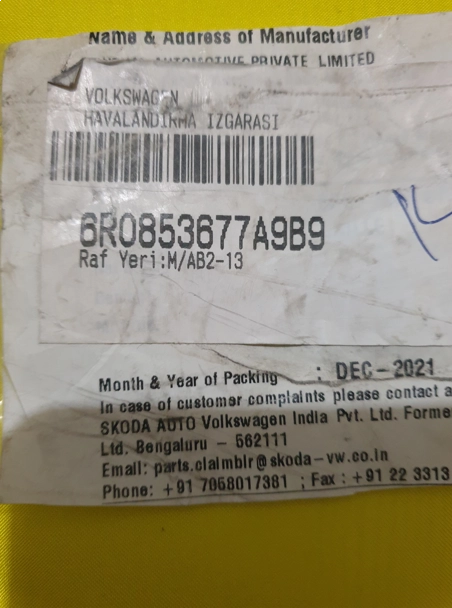 - VOLKSWAGEN POLO 2009> TAMPON IZGARASI ÖN ALT ORTA ÇERÇEVESİZ SİYAH OEM: 6R0853677A9B9 ORJİNAL ÇIKMA